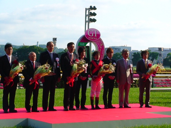 ゴール付近で行なわれた授賞式。勝利ジョッキーとなった横山典弘騎手にはヴォーカルの山下祐樹が、また勝ち馬ブエナビスタの馬主にはギターの井上慎二郎が花束を贈呈し、勝利を祝福した。