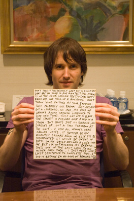 取材中にはサイン色紙書きもがんばってくれたティム、何を思ったか小さな字でビッシリと書き進めている。全部が埋まらないうちにインタビューは時間が来て終了してしまったのだが、それでも「最後まで書きたいんだ」と粘った結果が写真の通り。何が書いてあるか知りたい人は、発売中のクロスビート7月号(表紙はレッチリ!)を参照の上、プレゼントに応募して手に入れてください(もちろん、当選者は幸運な1名様のみ)。