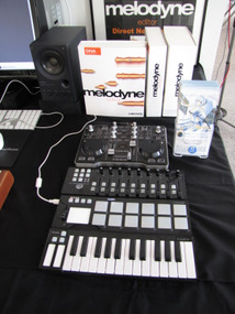 ▲手前からICON社のiシリーズ3モデル、HerculesのDJ CONTROL E2+、パッケージはオーディオ解析性能に定評あるMelodyne。和音の構成音ひとつひとつのピッチやリズム、ビブラートなどを簡単に編集可能だ。