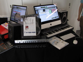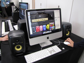 Logic Studio付属のライブパフォーマンス用ソフトウェア「Main Stage」のギターアンプシミュレーター機能にフォーカスしたデモが印象的だったのがアップルオンラインストアの展示。試奏用ギターを弾きまくる人が続出。ハードウェアは、iMac、MacBookのほか、アップルとApogeeの共同開発によるオーディオインターフェイス「GIO」や「duet」なども展示、実際に試せるようになっていた。