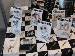 ▲ずらりと揃ったKlipschイヤフォンのラインナップ。イヤフォン本体のほか、ケースやイヤーピースも置かれている。
