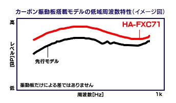 低域再生の充実も「HA-FXC71」「HA-FXC51」の大きな魅力だ。こちらは強靭で剛性の高い素材である「カーボン振動板」の採用により実現されている。ダイナミックな低域再生を可能としているのは、比重が軽く伝搬速度が速いというカーボンの音響特性によるもの。小型のヘッドホンは一般的に低域が弱く、無理に低域を充実させようと全体がボワンとした音像になっている製品も多いが、そうした心配は無用。無理なくメリハリの効いたバランスの良いサウンドを届けてくれる。