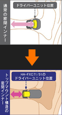 「HA-FXC71」「HA-FXC51」最大の特徴は、実際に音を出すドライバーユニットと鼓膜の距離を近づけたこと。他社が大口径のユニット採用する中、ビクターでは逆に口径5.8mmの大幅に小型化された「マイクロHDユニット」を開発。このユニットが耳のより奥に差し込まれるという独自の構造により、鼓膜まで音が混じり気なく到達し、高解像度サウンドの再生を実現しているのだ。これが画期的な「トップマウント構造」。耳穴に深く装着できる密閉構造から生まれる高い遮音性もポイントで、小さな音でも音楽にどっぷり浸れるというわけ。鼓膜の近くで音が鳴っているという実感はなく、自然な高解像度サウンドは一聴の価値アリだ。