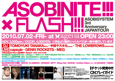 その全国ツアーのスタートとして、7月2日(金)に東京ageHaで開催される<ASOBINITE!!! × FLASH!!!>のラインナップが発表された。ライブアクトにはcapsule、GENKI ROCKETS、MEGといった、ビックネームを揃え、DJにはTOMOYUKI TANAKA、中田ヤスタカ、THE LOWBROWS、ALYNといった豪華な顔ぶれが集結。また別フロアのWATER BARでは、Hiroshi Nakamura、RAMRIDER、Tomoyuki Tajiri、Kentaro Takizawaといった人気ハウスDJ陣も出演する。