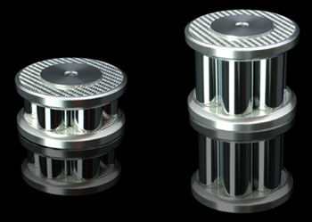 構成:A5052 アルミニウムをNC マシニング切削、アルマイト仕上げ(トップ・ボトムディスク× 各1)、テキサリュームFRP(レコード盤コンタクト面に貼付)、高純度真鍮 クロムメッキ(ウエイト×6・連結軸×1)、テキサリュームソフトシート(ウエイトスペーサー×1)