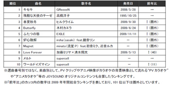 総合ランキングでは、2008年、2009年と2年連続総合ランキング1位を獲得したのがGReeeeN「キセキ」。また、2009年の日本レコード大賞で新人賞を受賞したヒルクライムの「春夏秋冬」が2009年のランクイン圏外から3位へ猛烈急浮上。「iroha(sasaki) feat.鏡音リン」、「minato(流星P) feat.初音ミク、巡音ルカ」、「supercell」といったVOCALOID系楽曲がランキングも上位に多数食い込んできており、ネットから生まれたヒット曲が、そのまま日常のカラオケに浸透している様子が良く分かる。