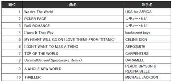 洋楽ランキングでは、名曲「We Are The World」が1位を獲得。カラオケルームで全員で合唱する様子が目に浮かぶようだ。そしてその後に続くのがレディー・ガガ。2010年はなりきりガガが全国にたくさん発生したことだろう。