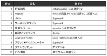 VOCALOID系でランキングをみてみると、アーティストランキングで登場したsupercellの作品は3位「メルト」が最高位となり、「炉心融解」と「magnet」が断トツの支持を得て1位2位を争った。もちろん今回ランキング初登場のラインナップだ。