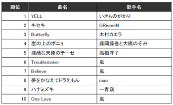 最後にカラオケJOYSOUND Wiiランキング。ゲーム機Wii向けカラオケソフト『カラオケJOYSOUND Wii』がインターネットに接続された状態で歌唱された中からのランキングだ。Wiiというゲーム機の特性もあってか、GReeeeN「キセキ」を2位におさえ、いきものがかりの「YELL」が1位に躍り出てきたのは、家庭で全世代が楽しむ様子の現れと思われる。もちろん「崖の上のポニョ」など、ファミリー向け楽曲の人気も健在。ここでの嵐人気は特筆。