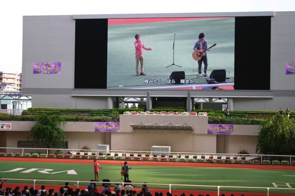 実は先月、東京競馬場で開催された<ヴィクトリアマイル>以来、全国規模でこの「ユメオイビト」が拍車をかけて浸透しているそうだ。<ヴィクトリアマイル>と言えば、ラムジが初めて競馬場でパドックライヴを行なったレースだが、この日以降、CDシングル「ユメオイビト」がロングセールスを記録。有線の問い合わせチャートでも上位にランクイン。さらに6月27日に開催された<宝塚記念>でも約4000人の競馬ファンを前にして「ユメオイビト」を熱唱したところ、即売会場には人が殺到し、長蛇の列ができた。