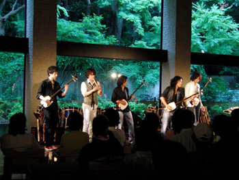 HIDE-HIDEと鳴り物の秀-hide-が登場し、男5人での演奏。尺八、三味線、鳴り物の音が鎌倉に響く。そして、突然開くステージ後ろの幕(?)。明るい時間に行われていたこのライブだからこそ、ステージの後ろには、美しい天然の新緑が存在した。自然の演出だ。直前に雨が降ったのも、新緑をより美しくしている。