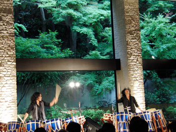 ライブは、鐘の音が響くなかスタート。篠笛の音が入り、一気に古(いにしえ)の世界へ誘われる。続いて、息のあったAUN二人で激しい和太鼓。強弱のリズムが心を揺さぶる。前日にフランス、モン・サン=ミシェルでのライブから帰ってきたばかりで、MCでは、「ボンジュールの気分で」なんて言葉も飛び出したり。