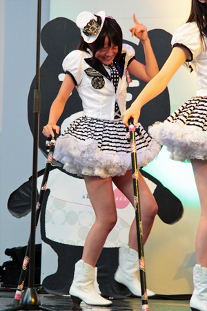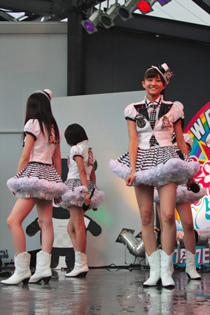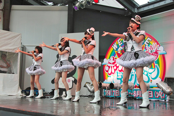 リリースされたばかりの新曲「〇〇 がんばらなくてもええねんで!!」を披露したのち、ライヴイベントではお決まり自己紹介へ。一番雨に濡れやすいポジションにいた小川紗季(サキチィー)は、口を開こうとした瞬間に吹きこんでくる雨と風に思わず「なんだよぅーもぅ!」と怒ってみせる。そんなサキチィーの姿にステージ前方に陣取った女の子ファンからは思わず「かわいいー!」の声が飛ぶ。