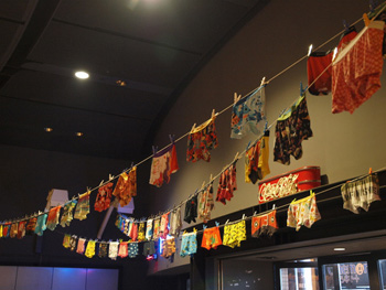 パンツを一緒にアートするプロジェクトを企画。会場ロビーにはカラフルなアートパンツが天井からロープでつりさげられ、つい笑ってしまうような愉快な壮観に。