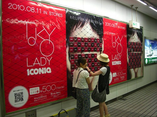 “ピールオフボード”とは、ポスターの上にグッズが付いていて、グッズを自由に持っていけるボードのこと。今回のICONIQのピールオフ街頭ボードには網タイツが付いていて、タイツがなくなると髪の毛が伸びたICONIQの新曲「TOKYO LADY」(8月11日リリース / 資生堂「マキアージュ」、「ウイダーinゼリー a-nation’10応援CM」CMソング)のジャケットが出現する仕掛けとなっている。