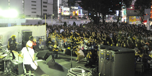 ライヴ直前まで降っていた雨が止んだことから、ステージ上に設置されていた屋根が急遽はずされることになり、予定より約1時間遅れてライヴがスタート。会場となった新宿ステーションスクエアの前は、早くから集まっていたファンをはじめ、約8000人の人だかりで埋め尽くされた。