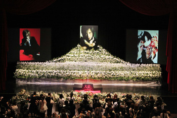 関係者を対象とした『お別れの会』終了後の午後2時半からは、一般向けの『献花式』が開始され、早くから会場周辺に集まっていた数多くのファンが入場。かつて2007年1月に蜉蝣が解散ライヴを行なった際の会場であるZEPP TOKYOは、ファンにとっても思い出深い場所ということになるはずだが、この日の場内には数多くの写真パネルやステージ衣装などがディスプレイされ、そこに足を踏み入れた途端に泣き崩れるファンも多く、なかには過呼吸に陥り救護されるファンの姿も。故人の写真が飾られ、左右に映像用のスクリーンが配されたステージ上の祭壇は、白を基調とした生花で埋め尽くされ、その中央にはかつて彼がいつも愛用していたマイクとお立ち台が、赤絨毯の上に設置されていた。まさに今すぐにでもその場に大佑が現れて歌い始めそうなその図を目にしたとき、参列者の多くにとって平静を保つことは容易ではなかったに違いない。近年のライヴやコメント映像、PVなどを上映しながらの、涙まじりの献花は夜間まで続き、最終的に当日の参列者は実に6,000人を超える結果となった。