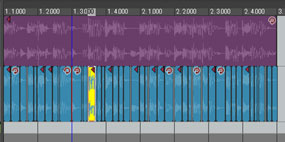 オーディオイベントにスライスを適用。音の頭でイベントが分割されるのであとは自由に組み替え可能だ。
