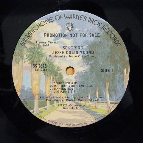 Jesse Colin Young『Songbird』のUSプロモ盤。これはピンクの丸いシールが貼られている。レコード・レーベルも白ではなく、同時期の通常盤とデザイン・色ともまったく同じレーベルに「PROMOTION NOT FOR SALE」の文字が印刷されているだけである。