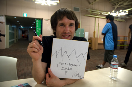 2月の来日時には読者プレゼント用の色紙に、取材中に思いついたことを小さな字で細かくびっしりと書いてくれたティム。今回も色紙を出すと、 「ああ、こないだは細かくたくさん書いたよねえ!」と笑いながら、シンプルに“フジロック・ヴァージョン”の色紙をササッと仕上げてくれた(写真参照)。クロスビート10月号では、このアッシュも含めてフジロックとサマーソニックの大特集を繰り広げているので、ロック・ファンは是非チェックを!もちろんこの色紙のプレゼント要項もそちらをご参照ください。