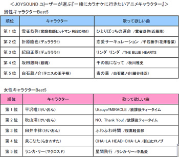 菅直人か小沢一郎か、政党の代表選も加熱している昨今だが、先日はAKB48の総選挙があったばかりと、なにかと総選挙が世間をにぎわせている。ならば、日本を代表する文化『アニメ』の人気投票を行なってはどうか…と、一緒にカラオケに行きたいアニメキャラクターと歌ってほしい楽曲が、ケータイサイトJOYSOUND[カラオケ]、JOYSOUND[歌詞]にて募集された。