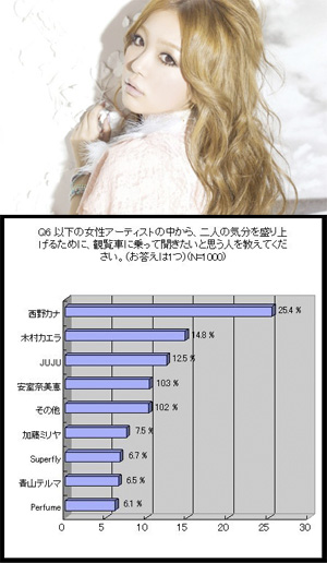 さらに、「観覧車に乗って聴きたい女性アーティストは?」という質問では、ケータイ世代から圧倒的人気を誇る歌姫・西野カナが1位を獲得。以下、木村カエラ、JUJU、安室奈美恵と続いた。
