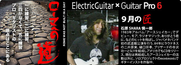 記事が掲載されている「ElectricGuitar」は、楽器店、リハーサルスタジオ、音楽専門学校で全国1000箇所6万部が無料配布されている、物欲を掻き立てる機材系フリーマガジン。ギター、アンプ、エフェクターからレコーディング機器、ソフトウェアまで情報満載の雑誌だ。なかでも注目が「ローマへの道」。プロミュージシャンが登場し、日頃のトレーニングのコツを公開するインタービュー記事で、これまでSyu(GALNERYUS/SPINALCORD)、山本恭司(BOWWOW)らが登場。そして、最新号では石原SHARA愼一郎がそのテクニックの秘密を明かしているというわけだ。