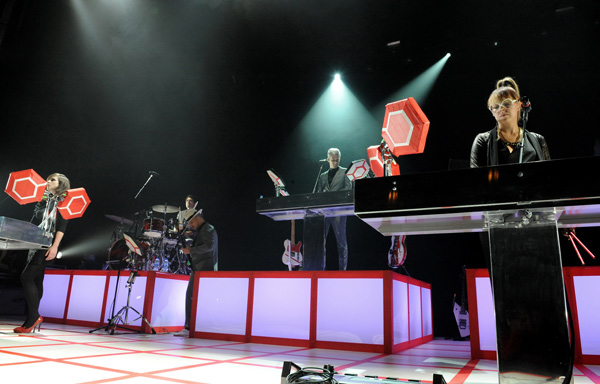 ロンソンとバンドThe Business Intl(女子はのぞく)は、おそろいのスリム・スーツで颯爽と登場。キーボード4台を使ったインストゥルメンタル・トラック「Circuit Breaker」でロンソン流粋な80’Sスタイル・ショウをスタートした。