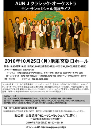 2010年10月25日(月)、浜離宮朝日ホールにてAUN J クラシック・オーケストラのモン・サン=ミシェル凱旋ライブが開催される。