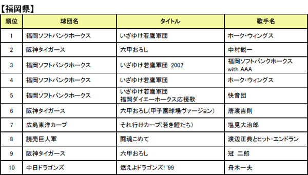 プロ野球応援歌 カラオケリクエストランキング(地区別)
