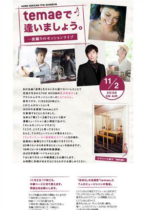 「島唄」をポルトガル語でカバーしたことで交流が生まれたTHE BOOMの宮沢和史とブラジル人ボサノバシンガーのCATIAだが、CATIAの来日スケジュールに合わせて「久しぶりにセッションでもしたいよね。」と、宮沢とのスケジュールを調整したことが、この生ライブの直接のきっかけだ。