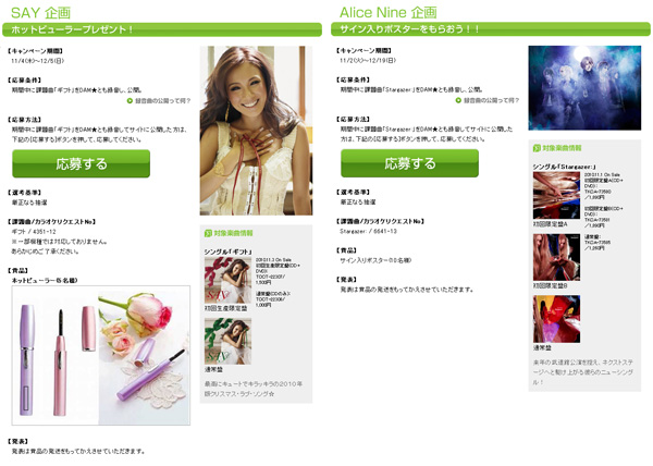 DAM★ともユーザーを対象に、指定曲を歌って公開すれば、そのアーティストのスペシャルグッズが当たるという「DAM★とも アーティスト企画」。11月に入り、SAYとAlice Nineのプレミアアイテムが追加された。