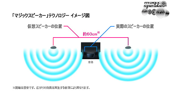 音楽を再生して驚くのが、実際にスピーカーがある位置よりも、少し左右に広がったところから音が鳴って聞こえること。およそ左右60cmくらい離れたところから聞こえてくる。これは、音量や時間差に特殊な処理をほどこす3D音響技術「マジックスピーカー」テクノロジーによるもの。これによって、音が広がって聴こえる効果が得られ、実際のコンパクトなスピーカーユニットの間隔よりもワイドなステレオ感を楽しむことができるのだ。音がワイドに聞こえることで、ポップスやロックは迫力を増し、クラシックなどのストリングスの音像もバッチリ。だから、スピーカーの前にiPodやiPhoneを立てて置く構造でも大丈夫。スピーカーの音が遮られるということがなくなるというわけ。