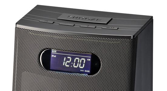 スピーカーの上部には常にデジタルで時刻が表示されるので、部屋に時計がなくてもとても便利。アラーム時刻機能として、曜日、時刻の設定ができ、指定した時刻にFMラジオやiPod/iPhoneを再生することができる。スヌーズ機能搭載なので、アラームを止めても5分後に再び自動再生を開始する。さらに、スリープタイマー(自動電源オフ)機能を搭載しているので、リモコン操作により、約30/60/90分間のスリープタイマー(自動電源オフ)を設定できる。