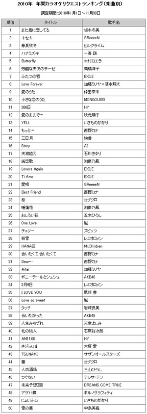 2010年「年間カラオケ・リクエストランキング」結果発表
