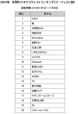 カラオケDAMにおける2010年の年間カラオケ・リクエストランキング結果が発表となった。調査は楽曲別とアーティスト別でそれぞれ集計されている。