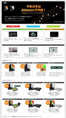 <Abletonウィンタースペシャル2010>は、開発元であるAbletonが世界的に実施する冬季キャンペーン“Get in Tune with Winter”の一環として行われる日本国内でのキャンペーン。期間内、全国の取扱店およびHRオンラインストアにてこれまでで最もお得な価格でAbleton Liveファミリーを提供する。
