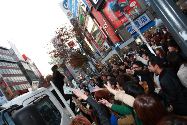 さらにそれで騒動は終わらず、6日夕方に渋谷スクランブル交差点に、黒装束に仮面をつけたメンバーが現れ、ライブ演奏しながら、国会土産のまんじゅうと共に宝探しの残金を撒いた。学校帰りの子供達や通りがかったサラリーマンや主婦2,000人ほどが入り乱れ、辺りはまさに騒然とした状態になった。