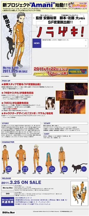 鉄コン筋クリート、FREEDOM、交響詩篇エウレカセブン等を手掛けた豪華スタッフが贈るSF密室脱出劇「ノラゲキ!」だが、DVD&Blu-Rayが2011年3月25日に発売となるまえに、2011年1月22日(土)より、全国5館にてイベント上映が決定している。劇中の音楽はcapsuleの中田ヤスタカが担当し、さらにその主題歌がMEGの未発表曲「黒ネコのタンゴ」になるという。イタリアの童謡「黒ネコのタンゴ」を中田ヤスタカのプロデュースでイタリア語でカバーしているというもので、要注目の作品だ。