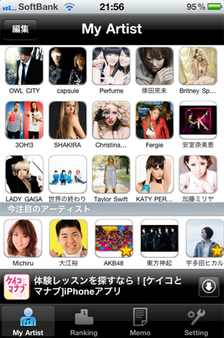 iPhone用音楽無料アプリ「歌手☆コレ」のMy Artistは十人十色、同じ画面の人は2人といないことだろう。そこにはみんなの音楽への想いやこだわりが表われるもの。