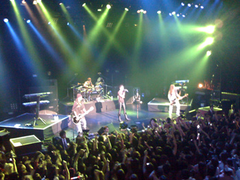 観客からトキオ・ホテル・コールが飛び交う中、ライブは「ノイズ」からライヴがスタート。フロントマンのビル(Vo)は、クラウザーさんもびっくり、デスノートの死神リュークも思わず一歩引くような強烈なインパクトで登場。派手なメイクとその衣装はオーディエンスを一気にひきつける魅力を携えているが、妖艶でパンキッシュな表情とパフォーマンスは、ドハデな衣装を脱ぎ捨てても何ら変わらぬもの。これこそ人々をひきつけてやまぬ天性のオーラだ。