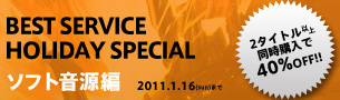 今回実施されるのは「BEST SERVICEホリデースペシャル」と題して、<人気ソフトウェア音源20製品の中から2点以上同時購入で40%OFF>、<サンプリングCD 30製品の中から2点以上同時購入で40%OFF>の2種類のキャンペーン。概要は以下のとおり。