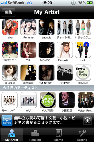 iPhone用音楽無料アプリ「歌手☆コレ」のMy Artistは十人十色、同じ画面の人は2人といないことだろう。そこにはみんなの音楽への想いやこだわりが表われるもの。