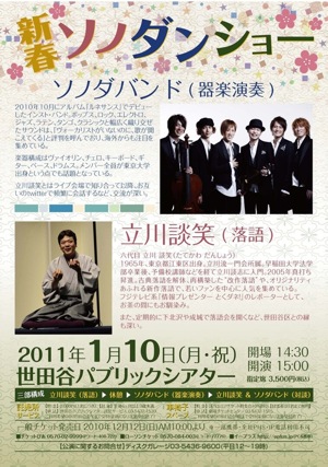 2010年にメジャーデビューをはたした東大生インストバンド・ソノダバンドが、2011年1月10日(月・祝)に、世田谷パブリックシアターにて、落語家・立川談笑とのコラボイベント<新春ソノダンショー>に出演する。