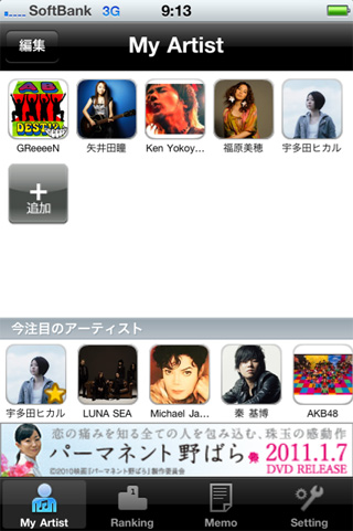 iPhone用音楽無料アプリ「歌手☆コレ」のMy Artistは十人十色、同じ画面の人は2人といないことだろう。そこにはみんなの音楽への想いやこだわりが表われるもの。