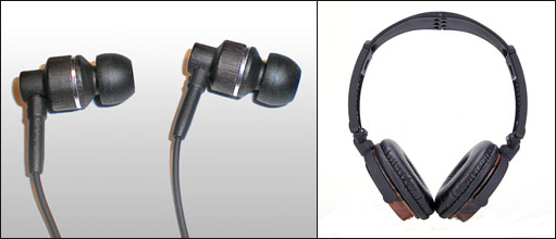 黒檀製ハウジング採用のカナル型ステレオイヤフォン(左)と折りたたみ式ヘッドフォン