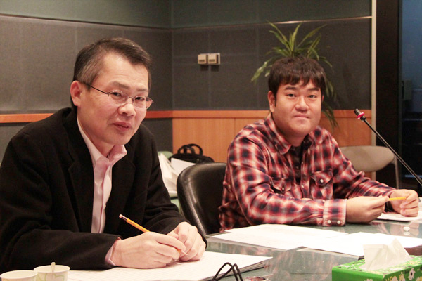お話をうかがった第一興商 制作本部 制作部 部長の下川一秀 氏(左手前)と、スタジオを案内してくれた制作本部 制作部 音源制作課 リーダー の小金井建彦 氏(右奥)