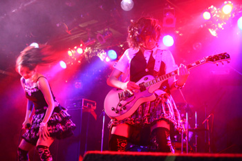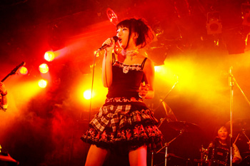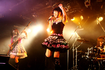 そしてここからライブは、2010年秋に発表した2枚のシングルからのナンバーも織り交ぜながら展開。英語をはじめ4カ国語を操るマルチリンガルでもあるASUKAは、英語バージョンで「デコウェイGO-GO!」や「Bye3」を披露、馴染みある曲を新たなエモーショナルで彩る。mixx結成以前からライブ経験豊かなSAKIとJACKSONは、それぞれダイナミックなプレイでオーディンスをさらに刺激。mixxの曲は覚えやすいポップ感を前面に打ち出したものが多い。しかし生のライブではそこだけが突出するのではなく、激しさもエキサイトメントも兼ね備えていた。それでいてライブ・パフォーマンスではキュンキュンするようなかわいさや、ときにはガチ上がりにさせる色気も放つ。さらに聖飢魔・譲りのMCやらJACKSONによる「こおろぎの歌」など、笑いのツボもしっかり押さえる。mixxの多彩な魅力で会場には異様な熱気が渦巻いていく。