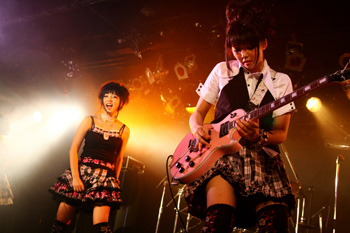 今回のリリース記念ライブでは、まずゲストとして番組にも出演した様々なアーティストやユニットが登場し、フロアを温めた。そして8時半過ぎ、ついにmixxがステージに。会場から起こった歓声に、輝く笑顔で応えるメンバー。今回のゲスト・ベーシストは「HEAVY METAL SWEETS」のレコーディングにも参加したガスマス子。装着するガスマスクで表情こそ分からないが、客席に手を振るなど彼女も興奮気味だ。
