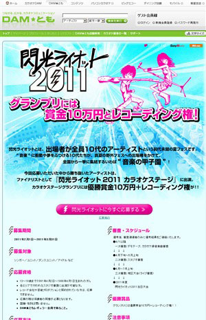ポイントは、DAM★ともから簡単にエントリーできるところだ。応募者の中から勝ち抜いたアーティストは、ファイナリストとして『閃光ライオット2011 カラオケステージ』に出演することができる。10代にとってとてつもなく名誉な閃光ライオットファイナリストになれば、きっと人生変わっちゃうくらいの刺激と感動が訪れることだろう。なお、カラオケステージ・グランプリには優勝賞金10万円+レコーディング権が与えられる。